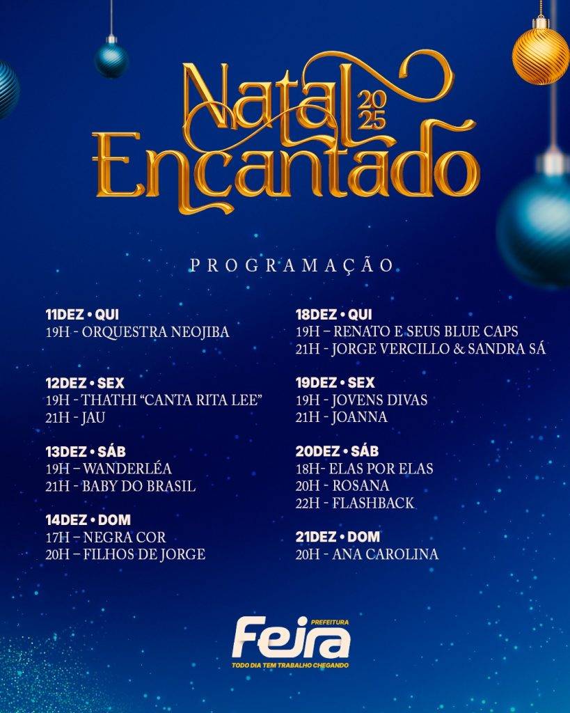 - Após cinco anos, o Natal Encantado 2025 retorna a Feira de Santana com o tema “Pra Viver Emoções”, prometendo uma edição especial que resgata a tradição natalina da cidade.