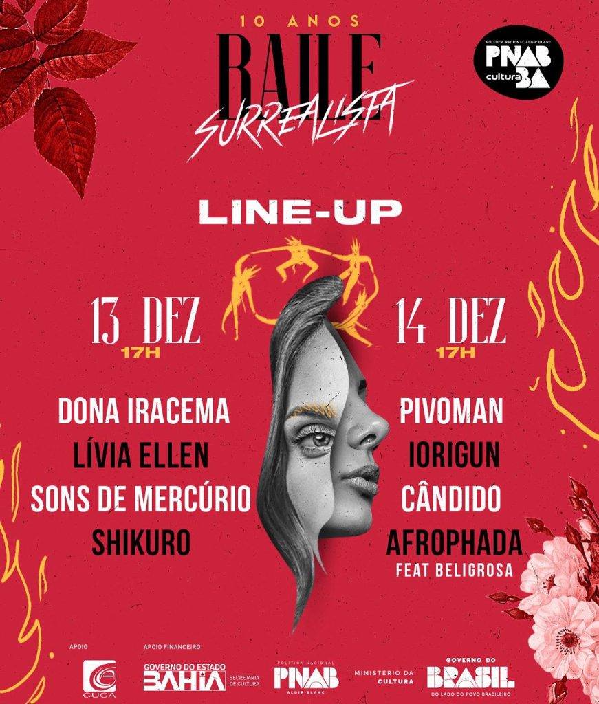 O Baile Surrealista 10 anos é um projeto contemplado nos Editais da Política Nacional Aldir Blanc Bahia, com apoio financeiro do Governo do Estado da Bahia, por meio da Secretaria de Cultura (SecultBA) via PNAB, direcionada pelo Ministério da Cultura – Governo Federal. Para mais informações, siga o perfil @bailesurrealista, no Instagram.