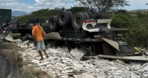 A carreta estava carregada com pedras de mármore, e parte da carga se espalhou pela estrada. Apesar da gravidade do acidente, o motorista sofreu apenas escoriações leves e recebeu atendimento no local. O veículo ficou destruído após tombar.