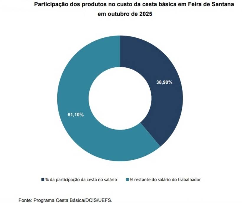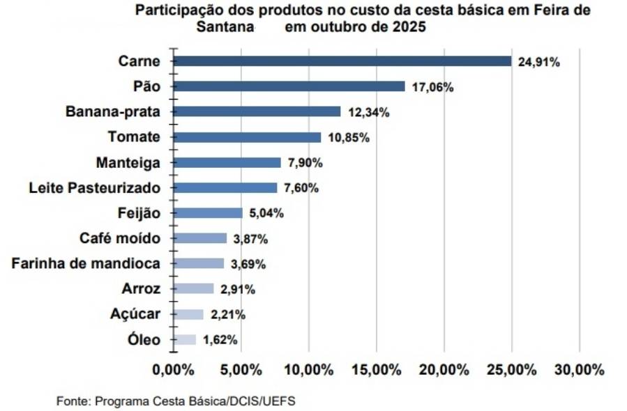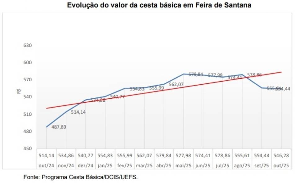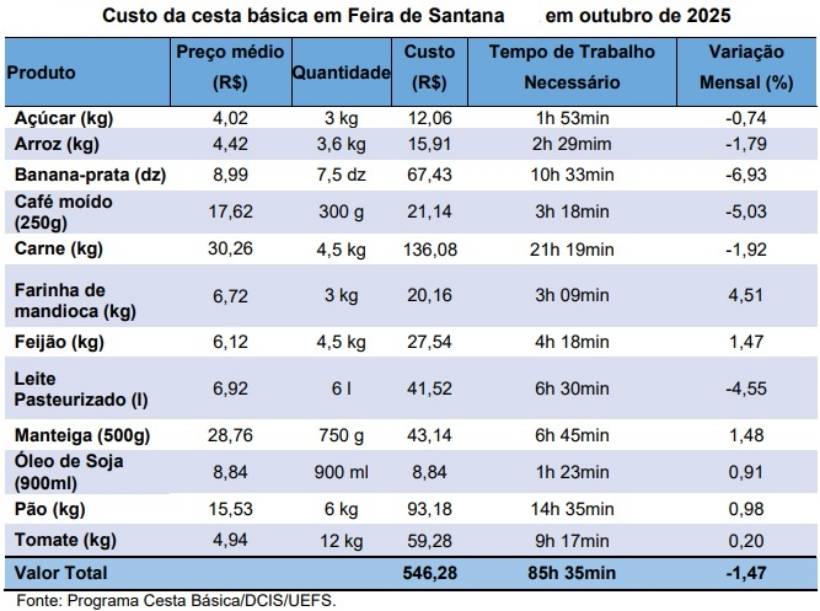 O valor da cesta básica, definida pelo Decreto-Lei Nº 399, de 30 de abril de 1938, que estabelece 12 produtos alimentares (arroz, feijão, farinha, carne, tomate, banana, óleo, café, leite, açúcar, pão e manteiga) e suas respectivas quantidades, passou a custar R$ 546,28 no mês de outubro de 2025, em Feira de Santana. Este valor representou queda de 1,47% em comparação com o mês de setembro, segundo a pesquisa do projeto “Conhecendo a Economia Feirense: o custo da cesta básica e indicadores socioeconômicos” da Universidade Estadual de Feira de Santana (UEFS).
