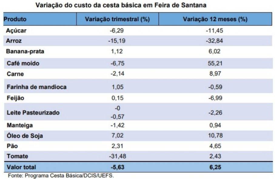Observa-se também que houve redução do preço de seis produtos no último trimestre (tomate, arroz, açúcar, feijão, café moído, e farinha de mandioca), essas reduções proporcionaram queda de 3,48% no preço da cesta básica de Feira de Santana.
