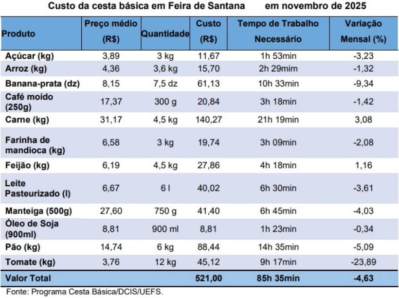 - A cesta básica em Feira de Santana custou R$ 521 em novembro de 2025, menor valor do ano e queda de 4,63% em relação a outubro.