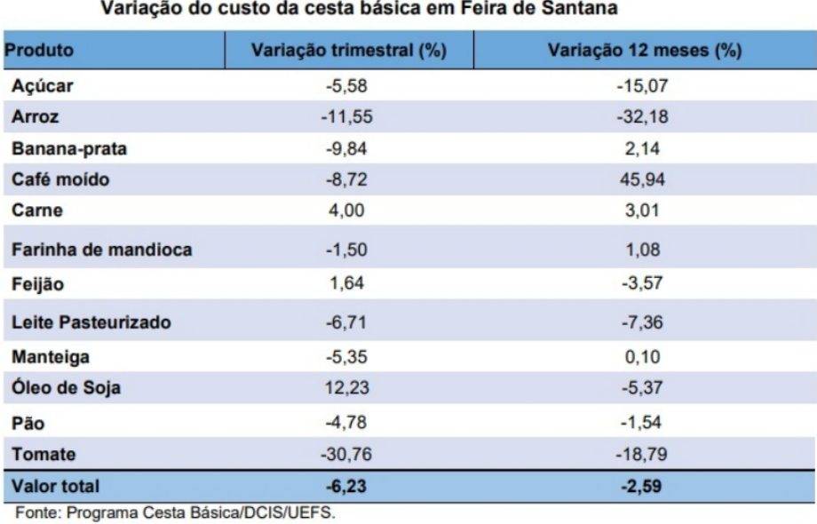 Segundo a pesquisa, observa-se que houve redução do preço de quase todos os produtos no último trimestre, exceto a carne e o feijão, essas reduções proporcionaram queda no preço da cesta básica de Feira de Santana.