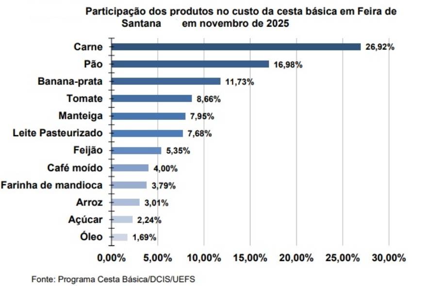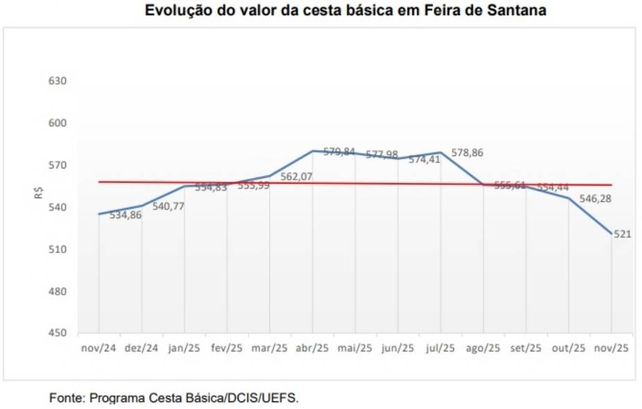 O valor da cesta básica, definida pelo Decreto-Lei Nº 399, de 30 de abril de 1938, que estabelece 12 produtos alimentares (arroz, feijão, farinha, carne, tomate, banana, óleo, café, leite, açúcar, pão e manteiga) e suas respectivas quantidades, passou a custar R$ 521 no mês de novembro de 2025, em Feira de Santana. Este valor representou queda de 4,63% em comparação com o mês de outubro, de acordo com a pesquisa do Programa “Conhecendo a Economia Feirense: o custo da cesta básica e indicadores socioeconômicos”, do curso de Ciências Econômicas, da Universidade Estadual de Feira de Santana (UEFS).