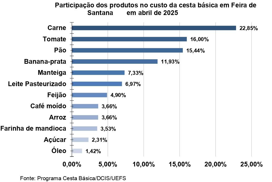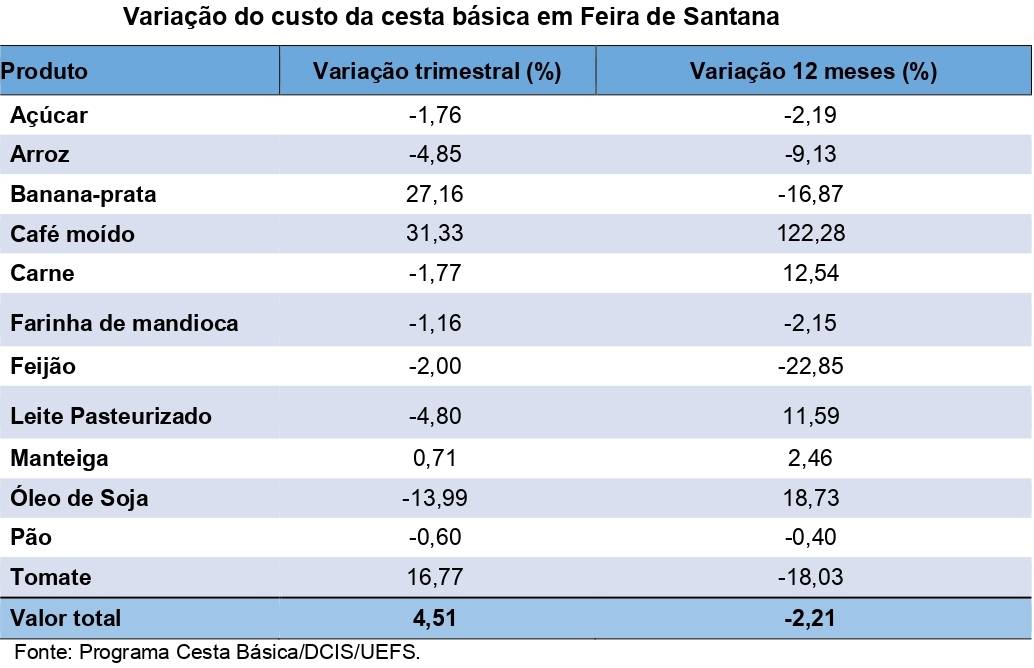 Segundo o estudo Custo da Cesta Básica e Indicadores Socioeconômicos da Universidade Estadual de Feira de Santana (UEFS), dos doze produtos que compõem a cesta, sete sofreram aumento em seus preços médios. Os produtos que registraram as maiores elevações foram o tomate (18,38%) e o feijão (4,30%). Os alimentos que tiveram as maiores reduções em seus preços médios foram o óleo de soja (-3,40%) e a farinha (-2,43%).