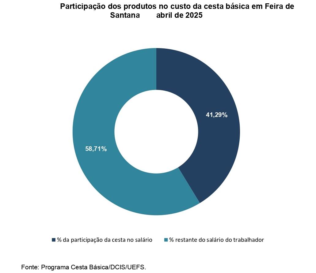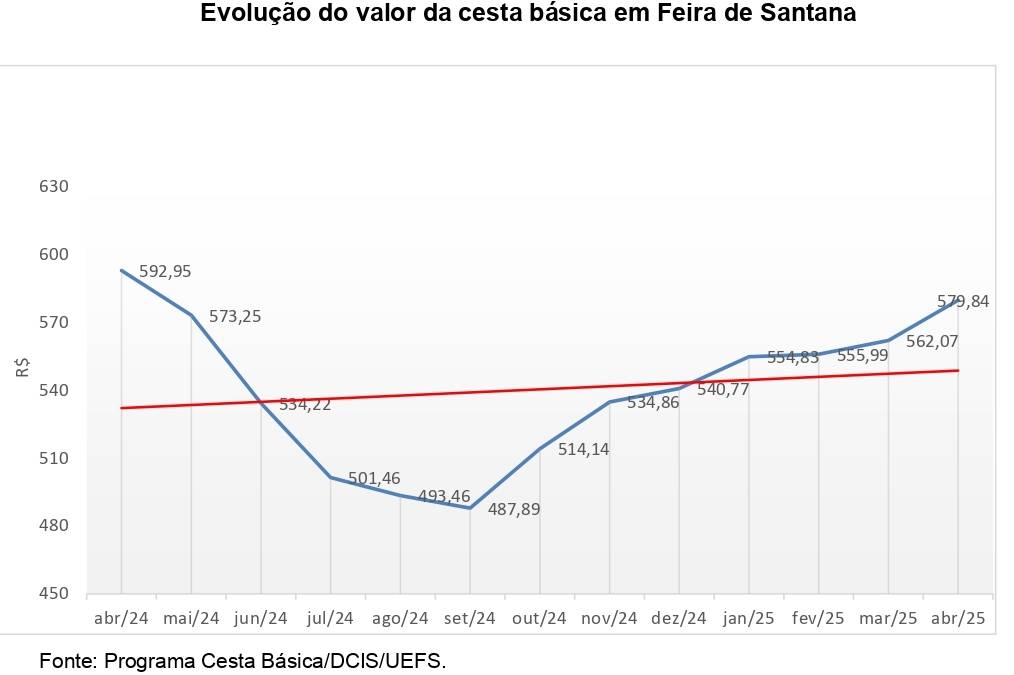 O valor da cesta básica que estabelece 12 produtos alimentares (arroz, feijão, farinha, carne, tomate, banana, óleo, café, leite, açúcar, pão e manteiga) e suas respectivas quantidades, passou a custar R$ 579,84 no mês de abril de 2025, em Feira de Santana. Este valor representou aumento de 3,16% em comparação com o mês de março.