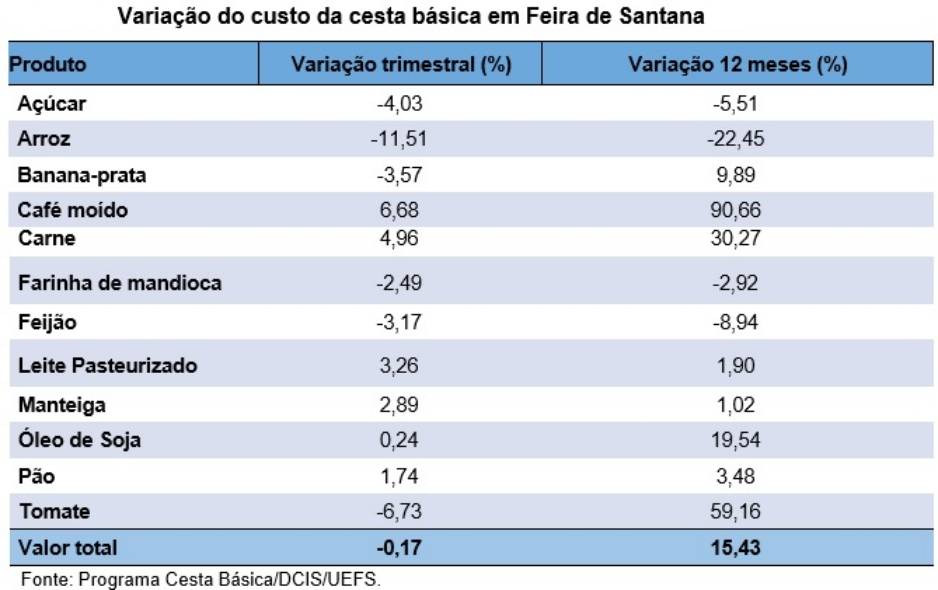 Ainda se observa a redução do preço de seis produtos no último trimestre (arroz, açúcar, banana prata, farinha, feijão e tomate). Essas reduções proporcionaram uma queda de 0,17% na cesta básica de Feira de Santana. No lado das elevações tiveram os seguintes produtos: café, carne, leite, manteiga, óleo de soja e pão.