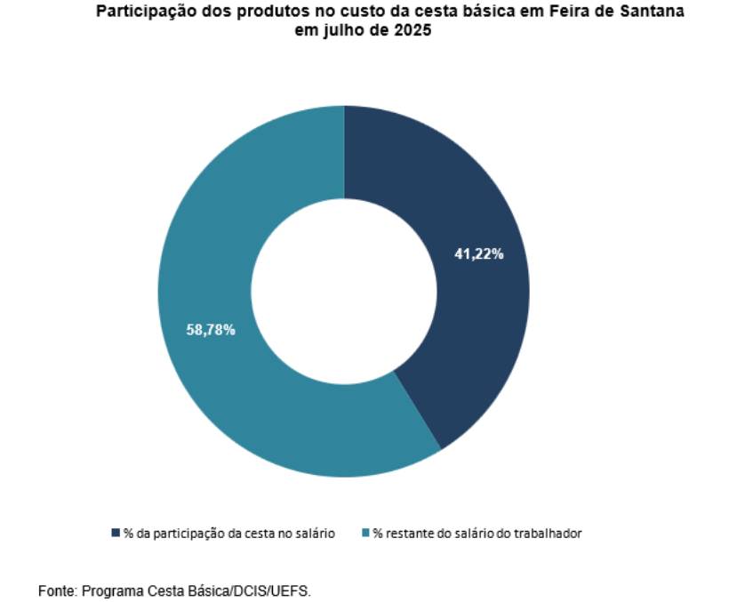 - O custo da cesta básica representa 41,22% do salário mínimo líquido em Feira de Santana, exigindo que o trabalhador dedique cerca de 90 horas e 41 minutos para comprá-la, aumentando em 1 minuto e 12 segundos em relação a junho.