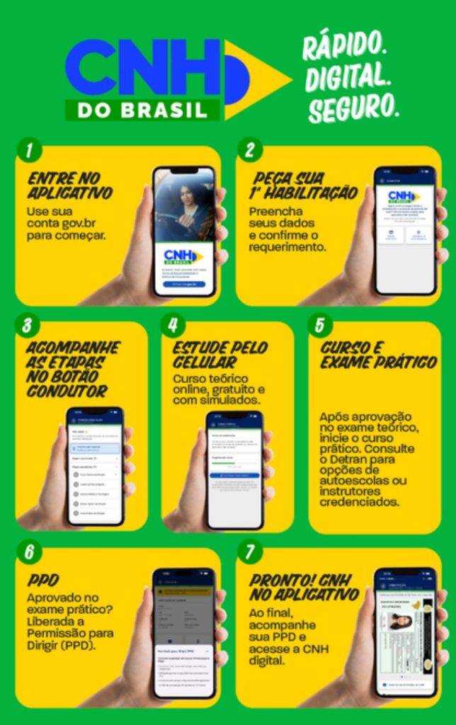 - O aplicativo CNH do Brasil permite abrir o processo da primeira habilitação, conferir dados via gov.br, escolher categoria e estado, além de acompanhar todas as etapas.
