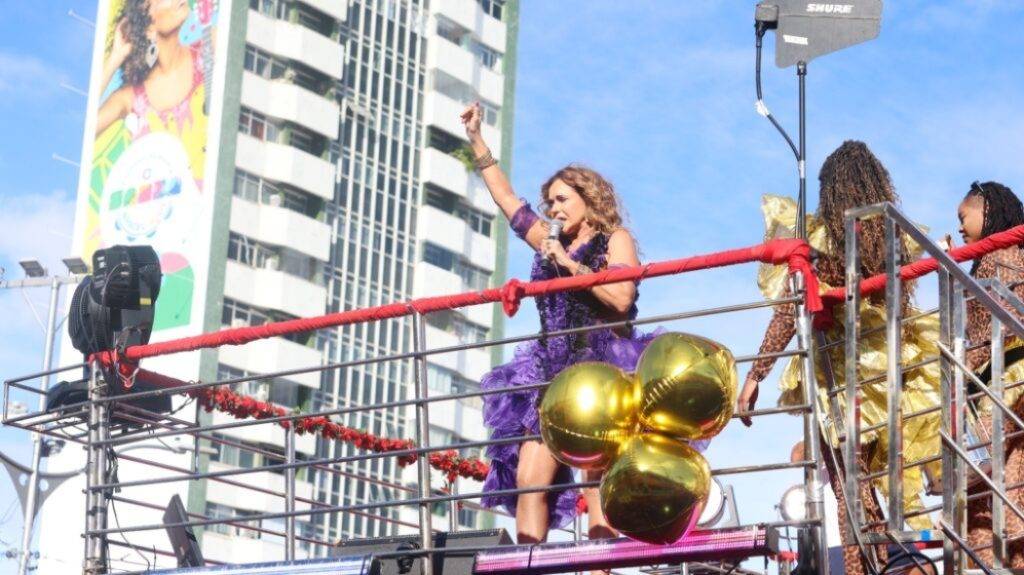 O momento mais alto do desfile veio logo em seguida, quando Ivete Sangalo convidou Daniela Mercury para subir ao trio e cantar com ela, deixando clara a admiração que sente pela artista: “deixa eu chamar a Rainha do Axé para cantar comigo”.