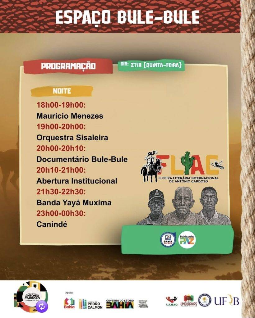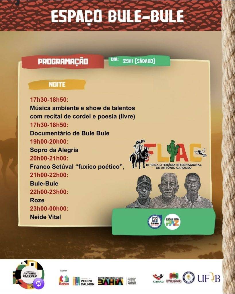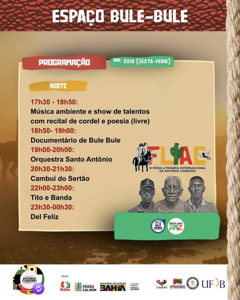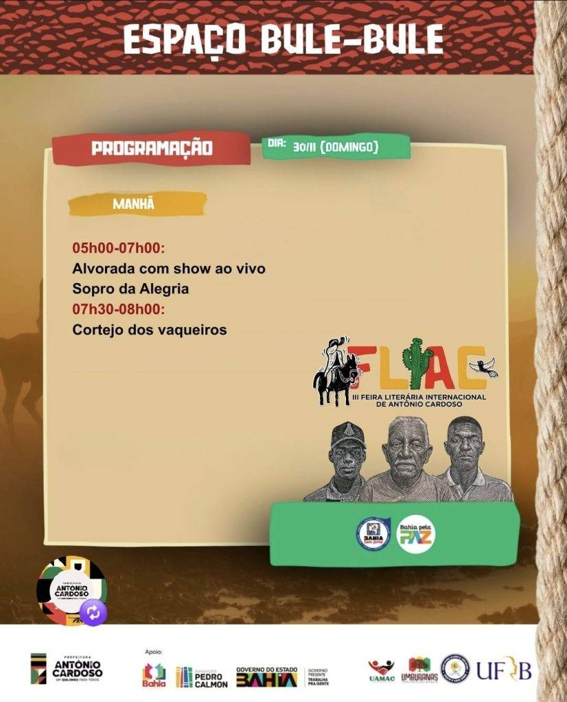 A 3ª edição da Feira Internacional de Literatura de Antônio Cardoso (FLIAC) tem início nesta quinta-feira (27) e segue até domingo (30), reunindo escritores, educadores, artistas, pesquisadores e a comunidade em uma ampla celebração da literatura e da cultura local. A programação estará concentrada na Praça Bule-Bule.