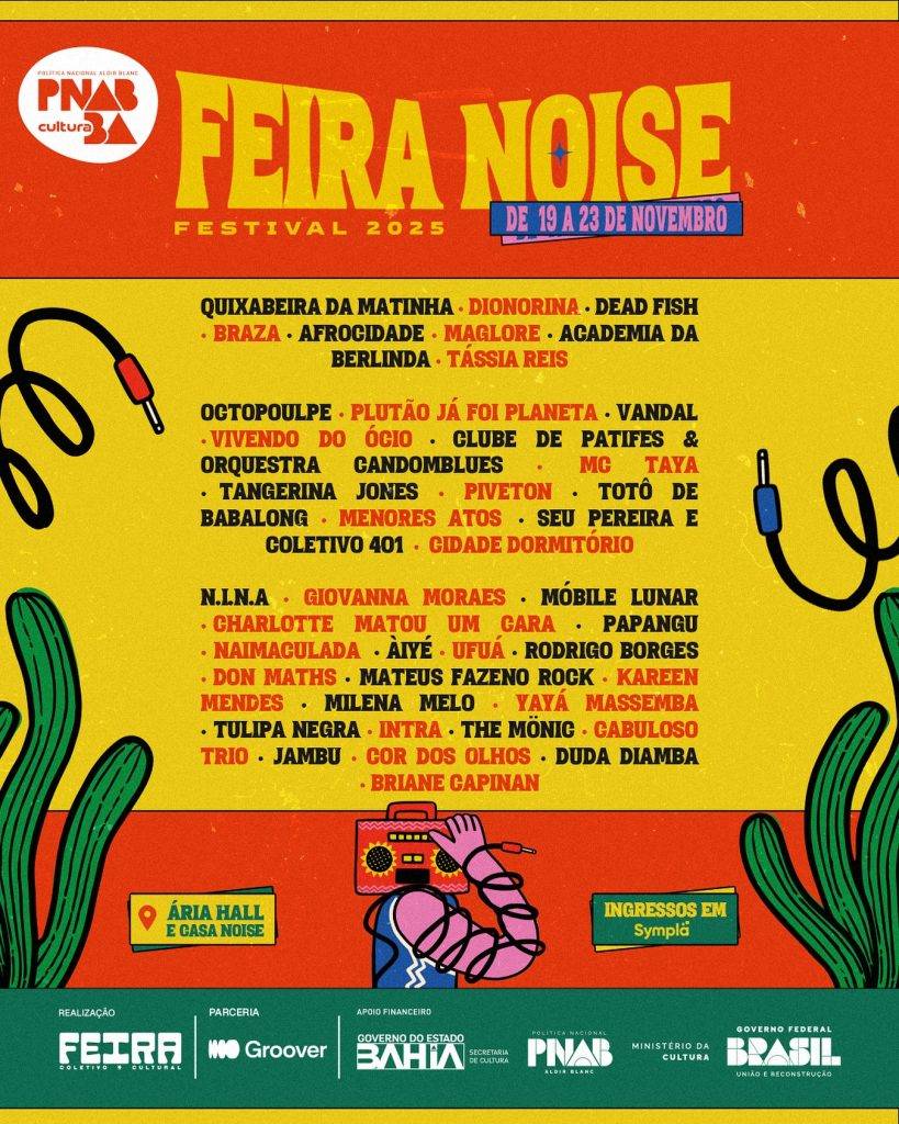 - O Feira Noise Festival 2025 acontece de 19 a 23 de novembro em Feira de Santana, com mais de 40 atrações entre shows, painéis, oficinas e ações formativas, distribuídas na Casa Noise e Ária Hall; ingressos já disponíveis no Sympla.