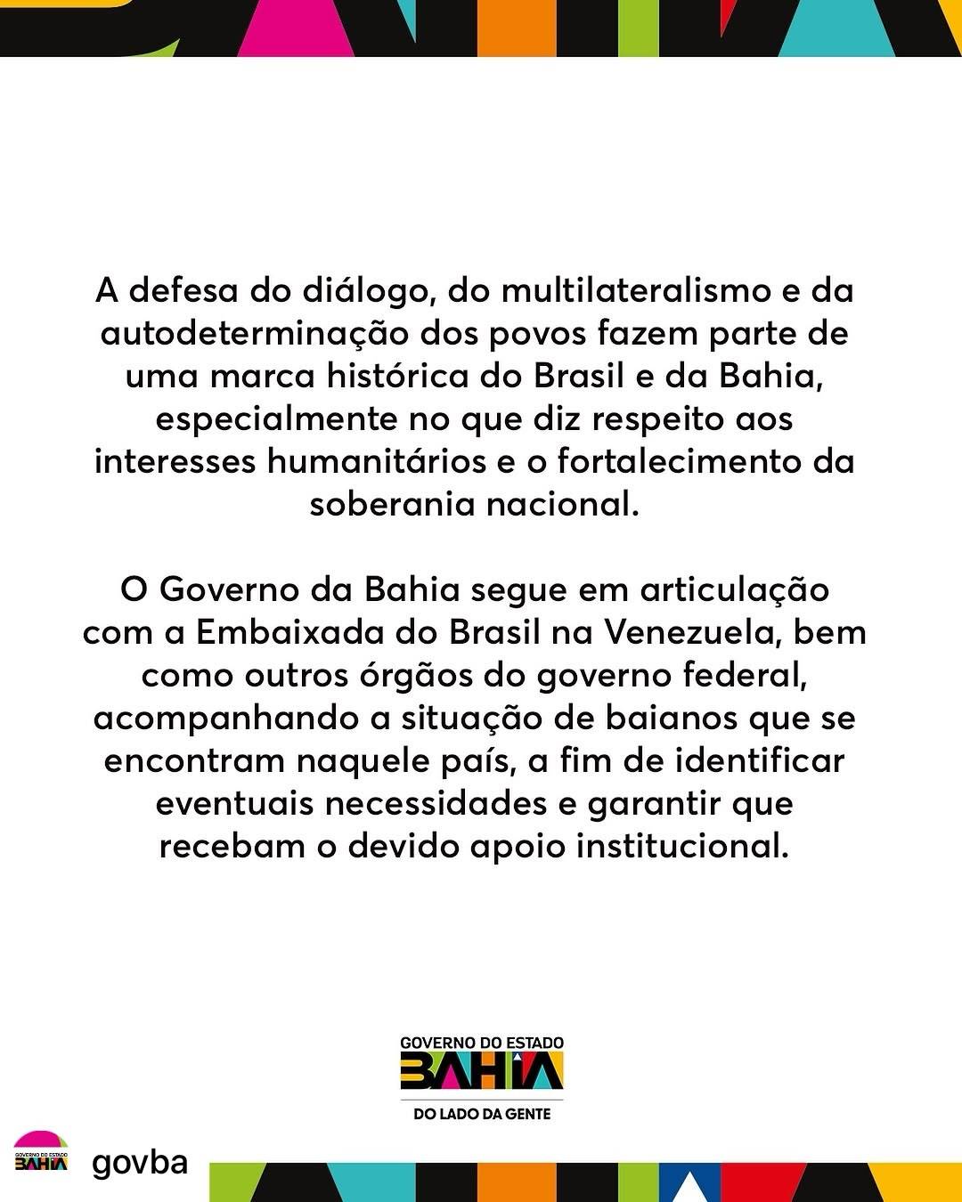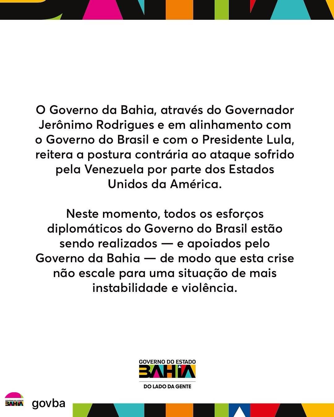O governador da Bahia, Jerônimo Rodrigues, manifestou seu posicionamento contrário à grave agressão sofrida por mais um país da América Latina, no caso a Venezuela, por parte de uma potência estrangeira.