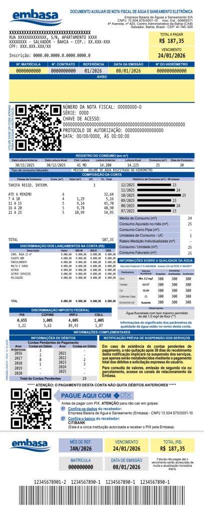 Ao contrário do que está sendo divulgado em vídeos, a conta da Embasa realmente mudou e começou a chegar aos baianos neste mês de janeiro. O layout foi atualizado e ganhou novos elementos visuais como destaque para o QR Code de pagamento via PIX, além de mais um QR Code relacionado à nota fiscal do serviço. Confira abaixo as mudanças.
