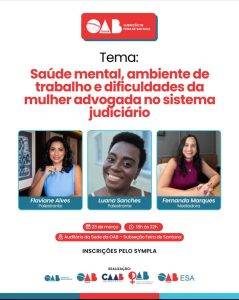 - O evento contará com painéis de debates sobre direitos das mulheres, saúde, ambiente de trabalho e uso de inteligência artificial em escritórios de advocacia, mediados por advogadas e psicólogas.