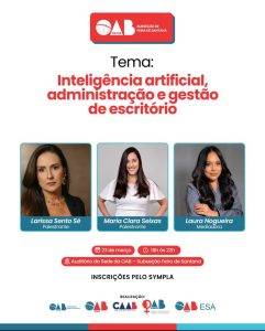 - A OAB Subseção Feira de Santana, com apoio da OAB Seccional Bahia, ESA e CAAB, promove a VI Conferência da Mulher sobre advocacia, inteligência artificial e saúde na segunda-feira (23), das 18h às 22h.