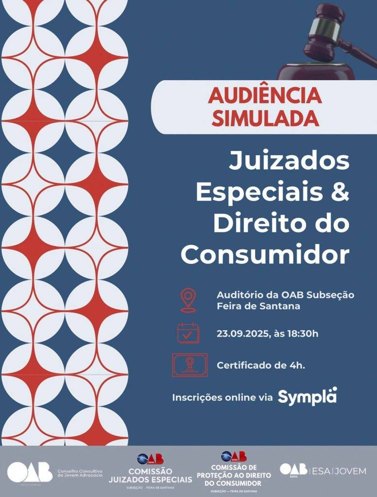 A OAB Subseção Feira de Santana sediará, nesta terça-feira (23), a partir das 18h30, no auditório da instituição, uma audiência simulada envolvendo as áreas de Juizados Especiais e Direito do Consumidor. O evento, organizado pelo Conselho Consultivo da Jovem Advocacia (CCJA), terá certificado de 4 horas, e os interessados precisam se inscrever através do site Sympla.