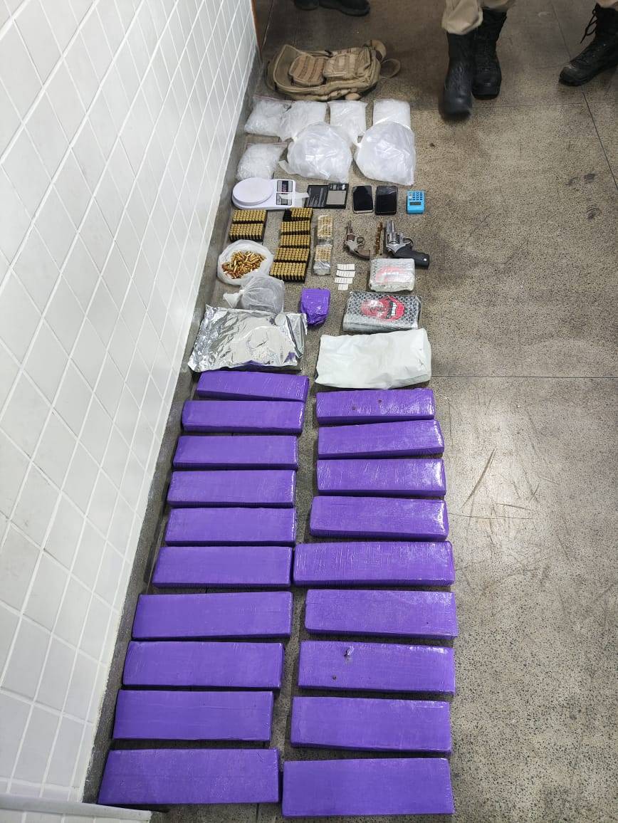 Os militares realizavam patrulhamento na localidade, quando avistaram um indivíduo que, ao perceber a presença da Polícia, demonstrou inquietação. Ao realizar a abordagem, a guarnição encontrou um revólver calibre 22, 492 munições de calibres .40, 38, 9mm e 380, duas balanças de precisão, 22kg de maconha, 1,5kg de cocaína, sete pacotes com pinos vazios e dinheiro em espécie.