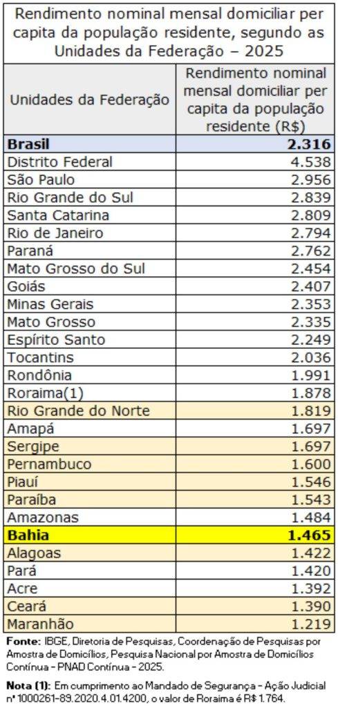 Em 2025, o rendimento mensal domiciliar per capita médio do Brasil ficou em R$ 2.316. Na Bahia, foi de R$ 1.465. O rendimento mensal domiciliar per capita resulta da soma dos rendimentos de todas as fontes de cada morador do domicílio (trabalho, aposentadoria, investimentos, programas sociais etc.) dividida pelo total de moradores. Ele é um indicador internacional de condições de vida.