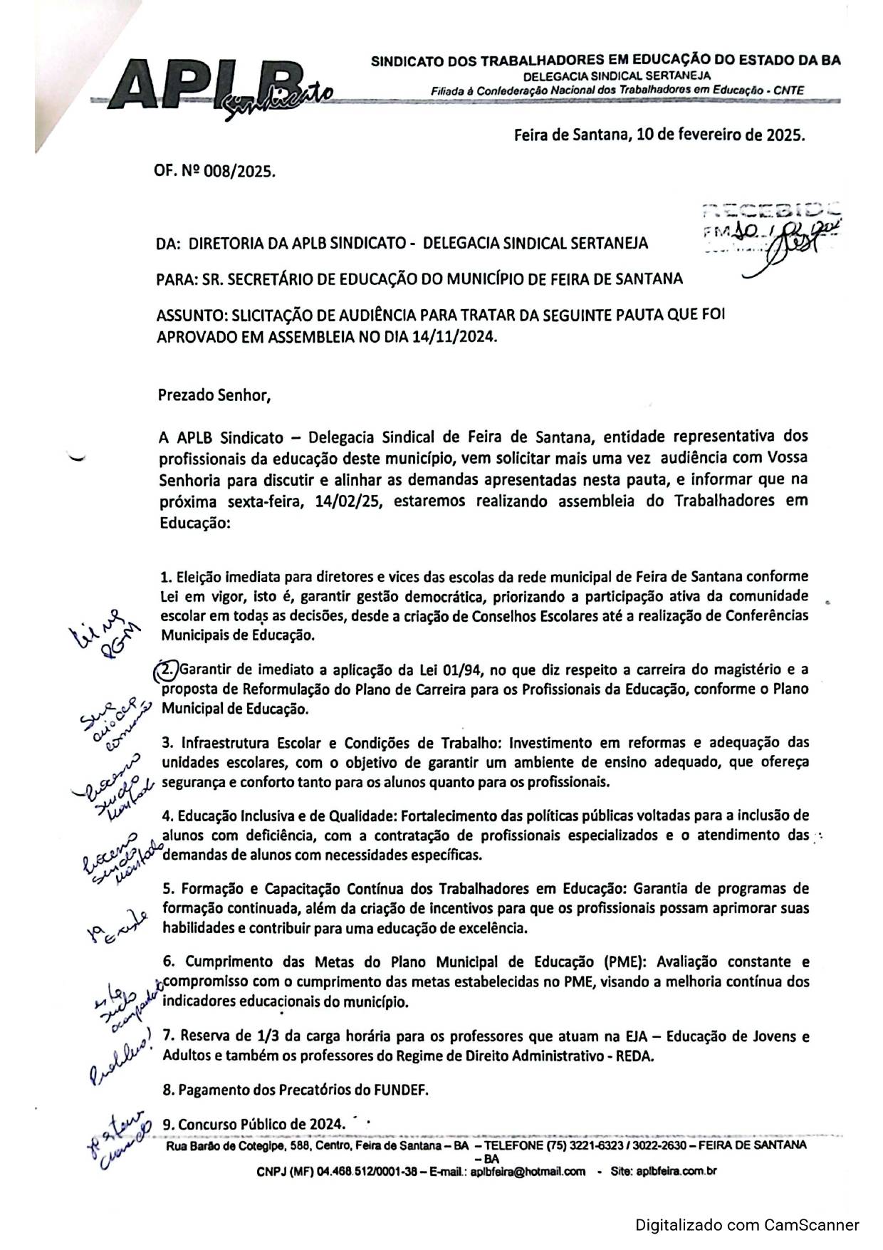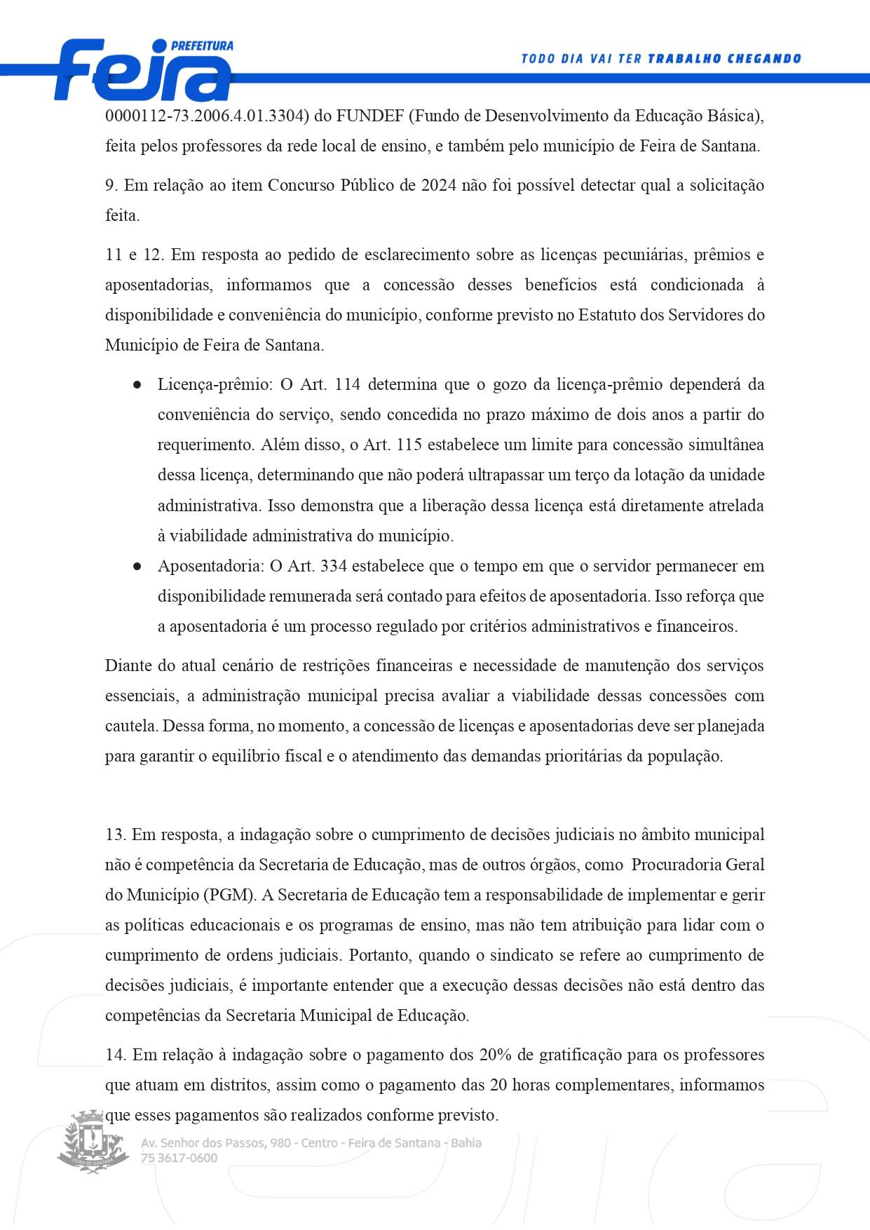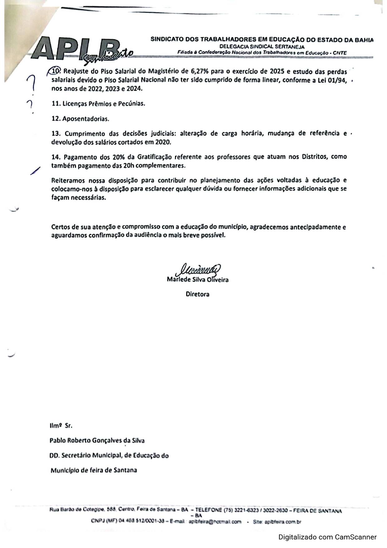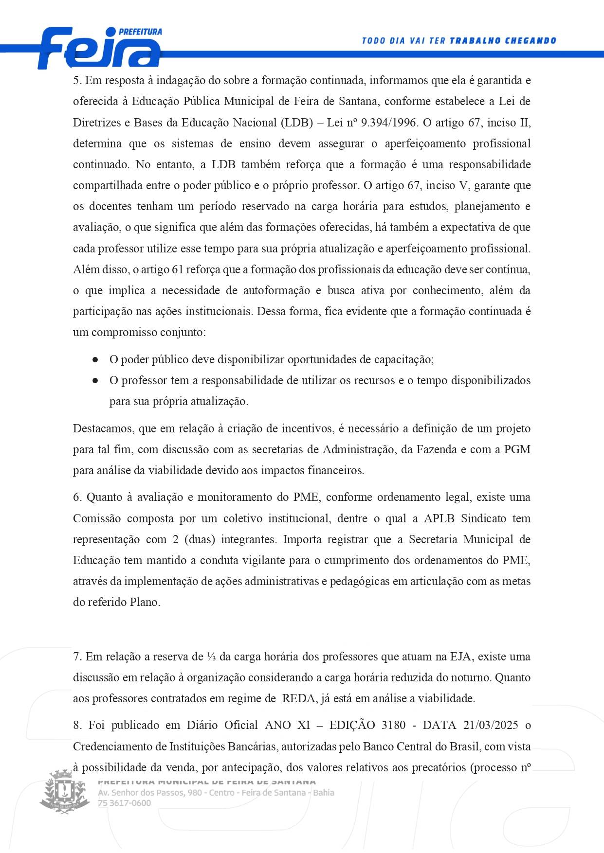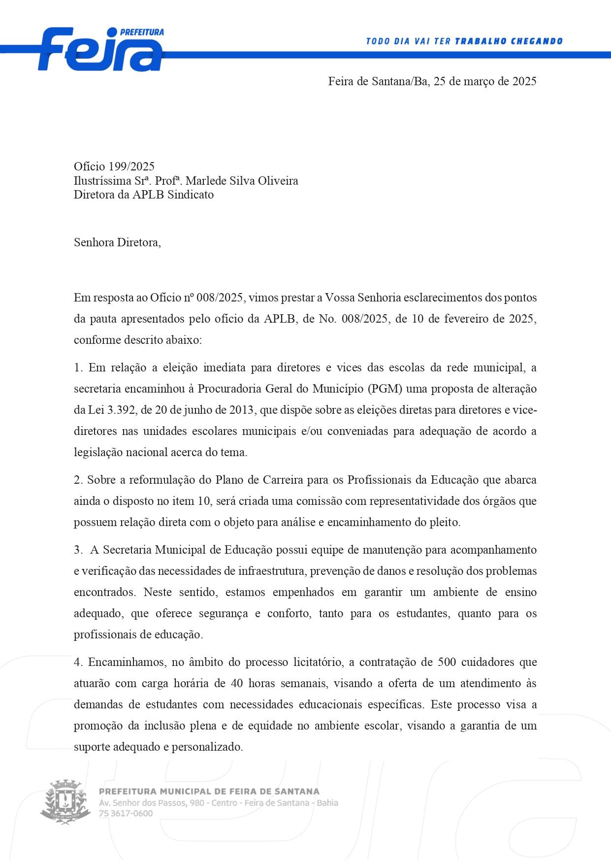É importante destacar que diversas reivindicações apresentadas pela APLB já estão sendo tratadas com seriedade e encaminhadas dentro dos trâmites legais, respeitando a legislação vigente e as condições orçamentárias do município. Medidas concretas estão em andamento, e todas as pautas enviadas pela APLB foram respondidas pela secretaria (segue pauta e ofício resposta em anexo).