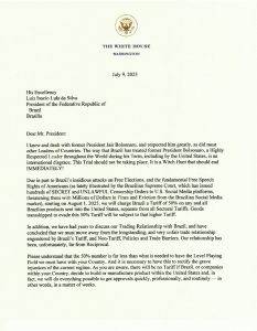 “Em parte devido aos ataques insidiosos do Brasil contra as eleições livres e os direitos fundamentais de liberdade de expressão dos americanos (como recentemente ilustrado pelo Supremo Tribunal Federal do Brasil, que emitiu centenas de ordens de censura SECRETAS e ILEGAIS a plataformas de mídias sociais dos EUA, ameaçando-as com multas de milhões de dólares e expulsão do mercado brasileiro), a partir de 1º de agosto de 2025, os EUA imporão ao Brasil uma tarifa de 50% sobre qualquer envio de produtos brasileiros aos Estados Unidos, além de todas as tarifas setoriais.”