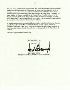 “Se você deseja abrir seus mercados comerciais até então fechados para os Estados Unidos e eliminar suas políticas e barreiras comerciais tarifárias e não-tarifárias, talvez consideraremos um ajuste nesta carta. Estas tarifas podem ser modificadas, para cima ou para baixo, dependendo da nossa relação com o seu país”, concluiu.